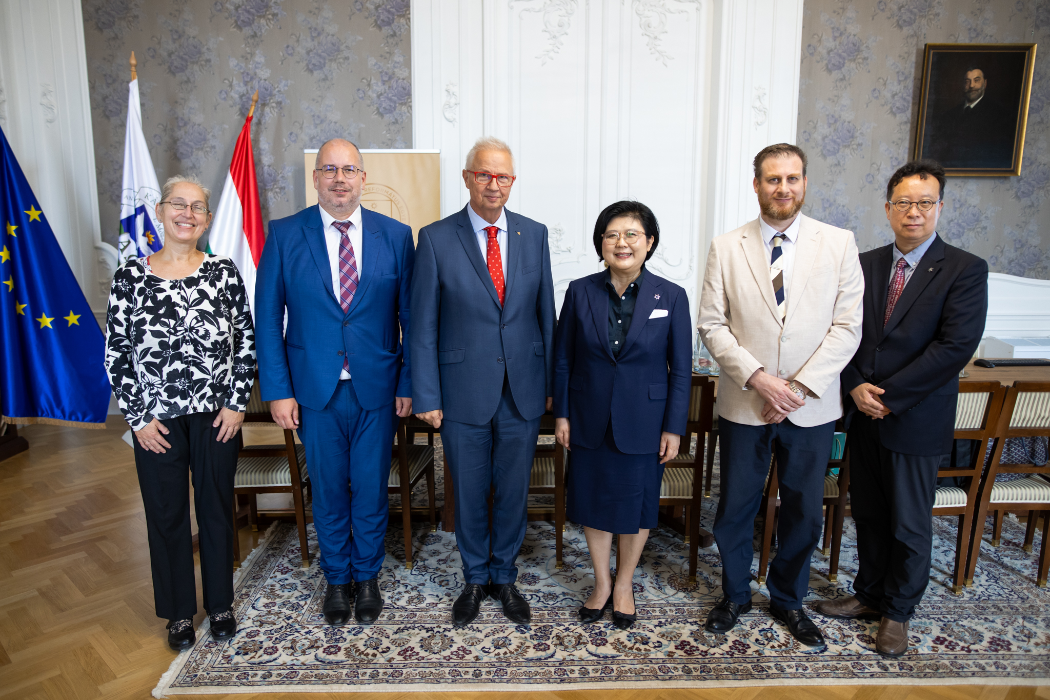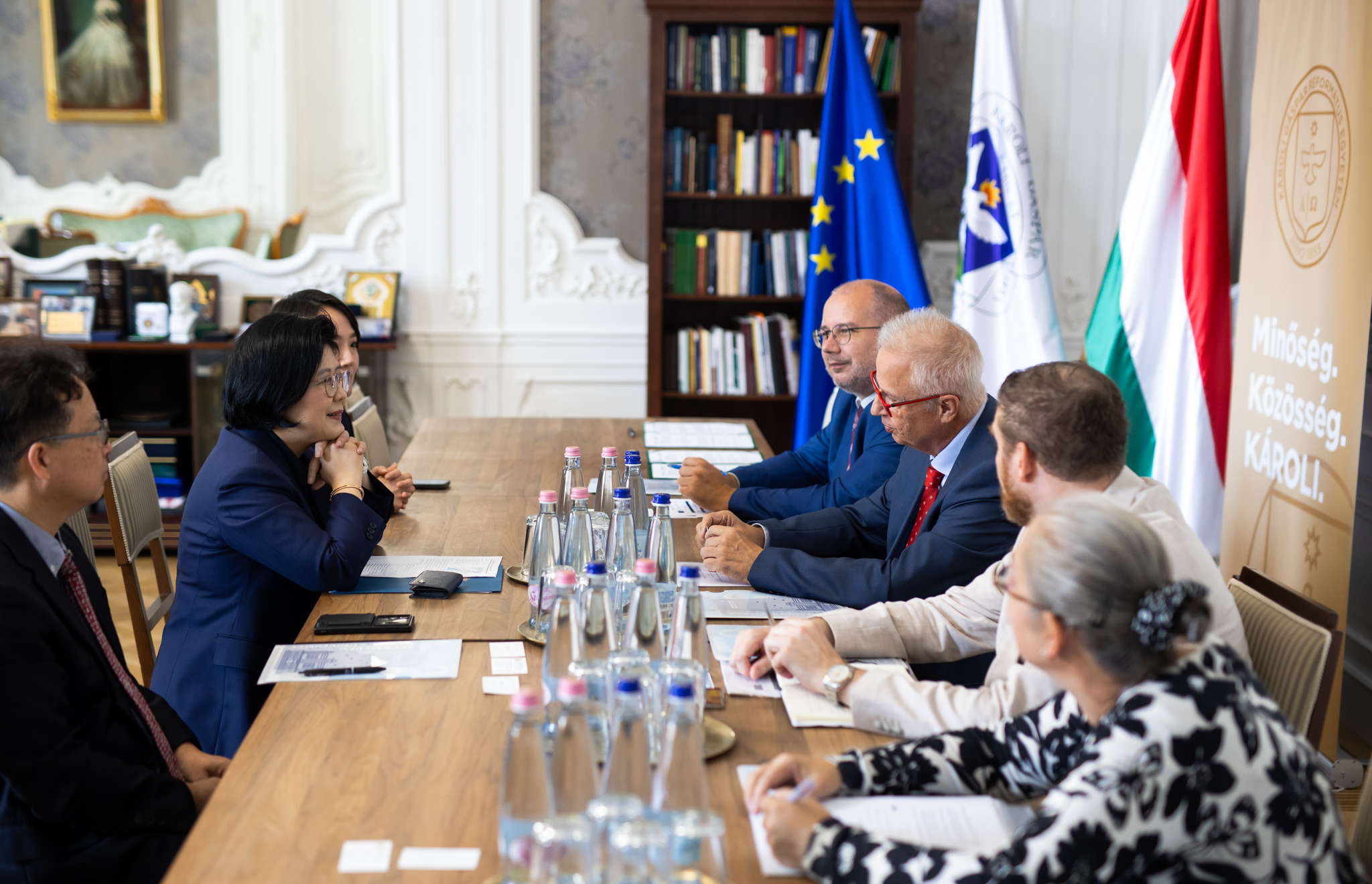 A koreai delegáció tagjait: Siyeun Moon rektort, Sehjae Chun nemzetközi kapcsolatokért felelős dékánt és Jinhee Lee főtitkárt Trócsányi László rektor mellett a Bölcsészet- és Társadalomtudományi Kar képviseletében Csoma Mózes dékán és Nagy Judit nemzetközi dékánhelyettes, valamint Szalai Gábor nemzetközi osztályvezető fogadta a Károlyi–Csekonics-palotában.