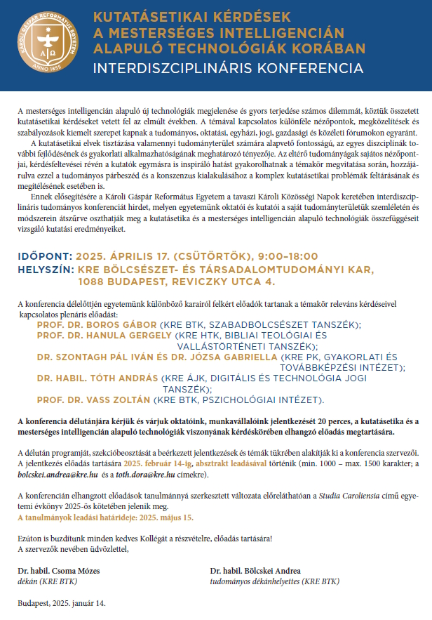 Egyetemünk 2025. április 17-én (csütörtökön) a tavaszi Károli Közösségi Napok (Tréninghét) keretein belül interdiszciplináris konferenciát rendez a KRE BTK Reviczky utcai épületében Kutatásetikai kérdések a mesterséges intelligencián alapuló technológiák korában címmel.