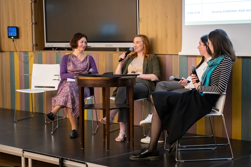 A délelőtti versenyt követően kerekasztalbeszélgetésre került sor alumni hallgatóinkkal, Csávás Lillával, Palya Noémivel és Papp Katalinnal. A beszélgetés, amelyet Dr. Kovács Edit tanszékvezető moderált, a német szakos diplomával való elhelyezkedési lehetőségek körül forgott, és a tanári pályát, a multinacionális cégeket és a kulturális szektort egyaránt érintő szakmai életutakat mutatott fel.