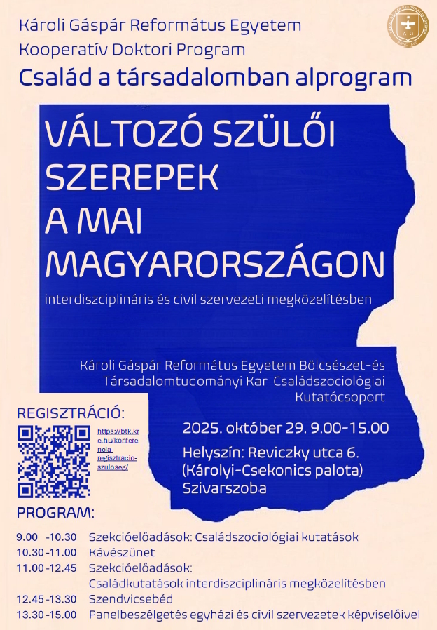 A Károli Gáspár Református Egyetem Kooperatív Doktori Program Család a társadalomban alprogramja keretében kerül megrendezésre a VÁLTOZÓ SZÜLŐI SZEREРЕК A MAI MAGYARORSZÁGON – INTERDISZCIPLINÁRIS ÉS CIVIL SZERVEZETI MEGKÖZELÍTÉSBEN című konferencia 2025. október 29-én 9.00 órától a Károlyi-Csekonics Palota Szivarszobájában.