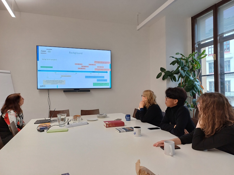 2026. január 29-én a BTK két első éves, az európai lexikográfia nemzetközi közös képzésben részt vevő hallgatója, Iryna Sapiazhynskaya és Zillan Bunaya Wildan három, a képzésben oktató károlis kollégával (Dr. habil. Hollós Zita, Dr. Pődör Dóra, Dr. habil. Anne Tamm) az Osztrák Tudományos Akadémiára látogattak, hogy megismerkedjenek az ott folyó lexikográfiai kutatásokkal. Bécsi vendéglátónk Dr. Katharina Kopeczky-Kröll nyelvész volt, aki részletesen beszámolt az Osztrák Tudományos Akadémián folyó lexikográfiai kutatásokról – elsősorban a német nyelvjárás-kutatásokról. A károlis küldöttség tárgyalt továbbá a gyakornoki lehetőségekről is, mivel az angol és német nyelven folyó EMLex-képzésben kötelező a szakmai gyakorlat elvégzése. Az Osztrák Tudományos Akadémia szívesen fogadna németül jól beszélő EMLex-hallgatókat a lexikográfiai projektjei számára gyakornokként, és a két intézmény közti együttműködést mindkét fél bővíteni kívánja.