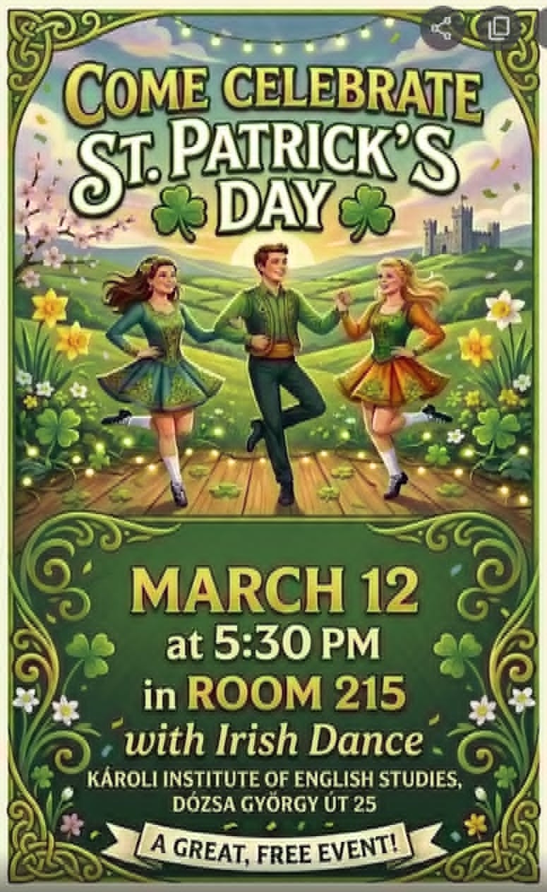 2026. március 12-én 17:30 és 19:15 között került sor a D25-ben a Szent Patrik-napi ír estre, amellyel az Anglisztika Intézet egyben a 2026 szeptemberében elindítandó Ír stúdiumok specializációt is reklámozni kívánta az anglisztika alapképzési szakos hallgatók számára.